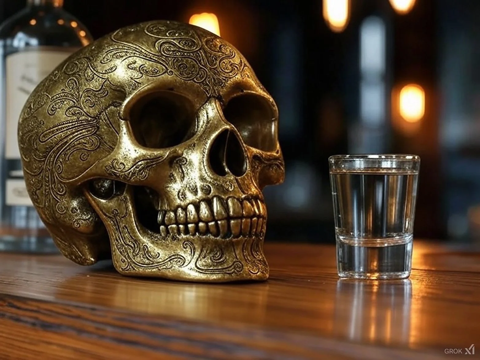 Dana (@79vwgreenbean) took one look at that moody photo I posted – the ornate golden skull brooding next to a lonely shot of tequila like some battle-weary pirate who’s seen too many sunsets – and decided it deserved to live on paper.