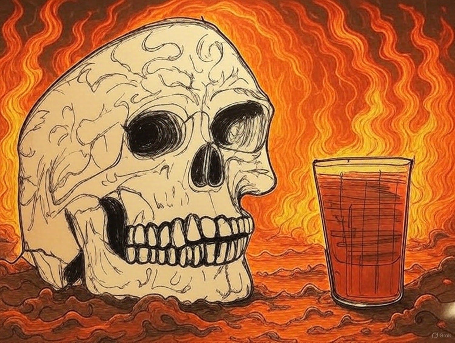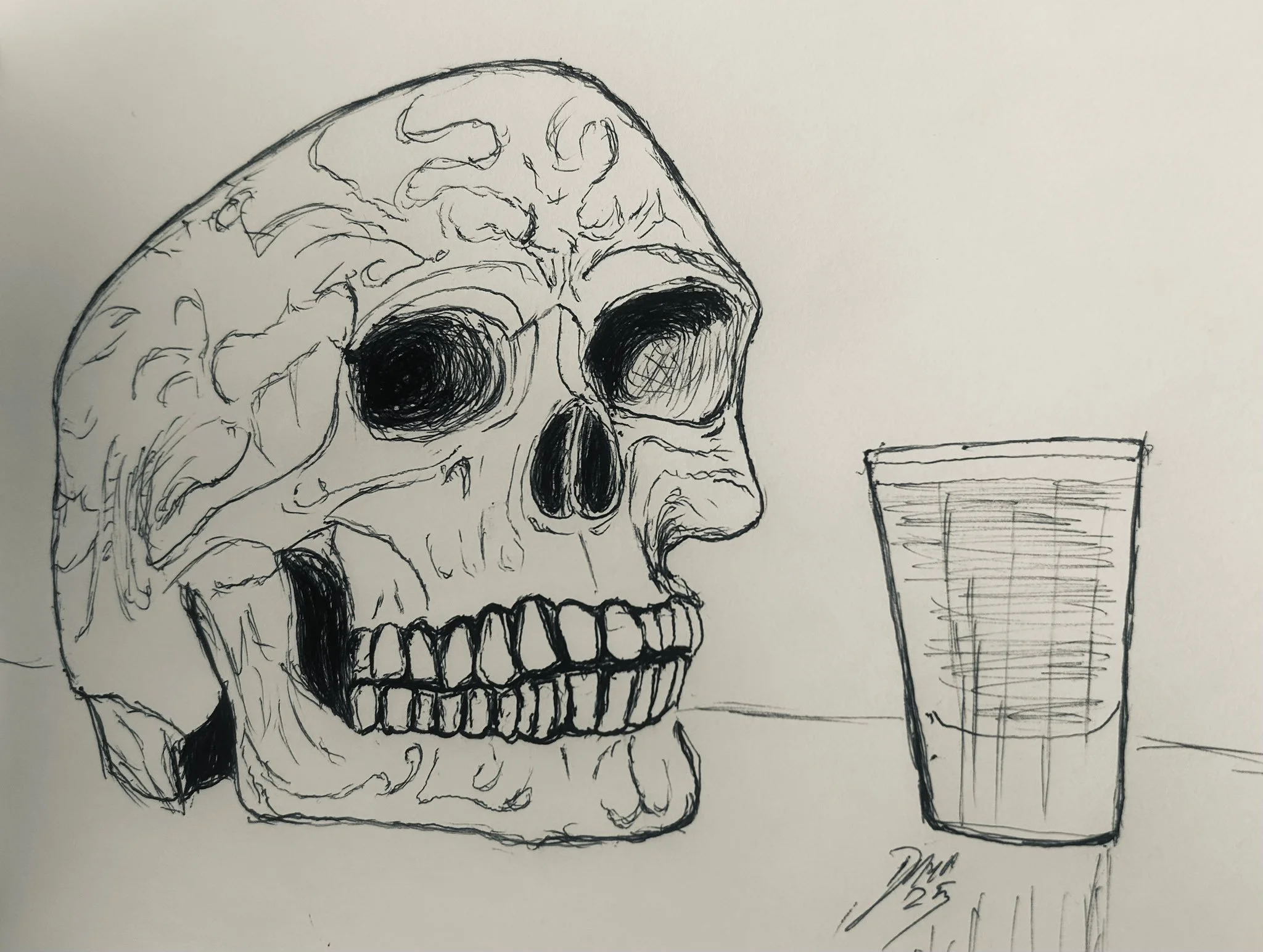 With just a pen and a sheet, he transformed my battered, intricately engraved skull into a raw, expressive sketch. The filigree patterns that took the original sculptor hours to carve became loose, energetic scribbles that somehow feel even more alive. He darkened the eye sockets into deep black voids, gave the teeth that perfect jagged snarl, and let frantic cross-hatching spill across the cheekbones like old war wounds. The little shot glass got its own chaotic shading, looking like it’s trembling slightly on the page.